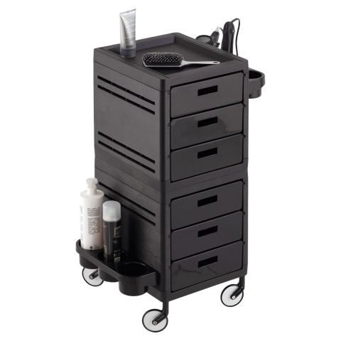 Comair Ceriotti Stapelboy Ciak Carrello Black ist ein robuster, mobiler Arbeitswagen für Friseure. Der Arbeitswagen hat 6 Schubladen, die sich ideal für die Aufbewahrung von Sprühdosen, Shampooflaschen und anderem Friseurbedarf eignen.