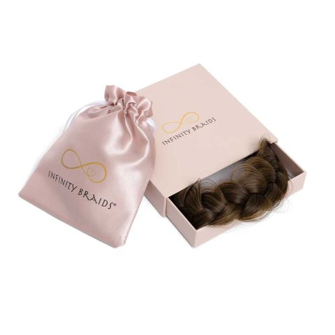 Infinity Braids -Vienne Messy Copper Bronze braid, ein wunderschöner geflochtener Look im Handumdrehen! Lernen Sie unser Infinity Braids kennen. Mit diesen geflochtenen Haarbändern sieht es so aus, als hätten Sie Ihr Haar selbst geflochten, aber ohne den Aufwand. Es gibt drei Modelle: Lizzy regular, Jolie fishtail und den Vienne messy braid.