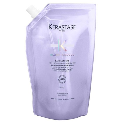 Kérastase Shampoo ml Blond Absolu Bain Lumiére Refill 500 bietet die gleiche hochwertige Pflege wie das Original-Shampoo, jetzt in einer umweltfreundlichen Nachfüllpackung. ml Das Shampoo 500 Refill besteht zu 100 % aus recyceltem Kunststoff* und verbraucht 82 % weniger Plastik**. Das speziell für blondes Haar entwickelte Shampoo kombiniert die feuchtigkeitsspendende Wirkung von Hyaluronsäure mit den schützenden Eigenschaften von Edelweiß. Die Formel reinigt das Haar gründlich und entfernt stumpfen Schmutz, während es die Haarfaser mit Feuchtigkeit versorgt und weich macht. Damit ist das Shampoo ideal für Haar mit Strähnchen, gebleichtes, graues oder leicht entfärbtes Haar.