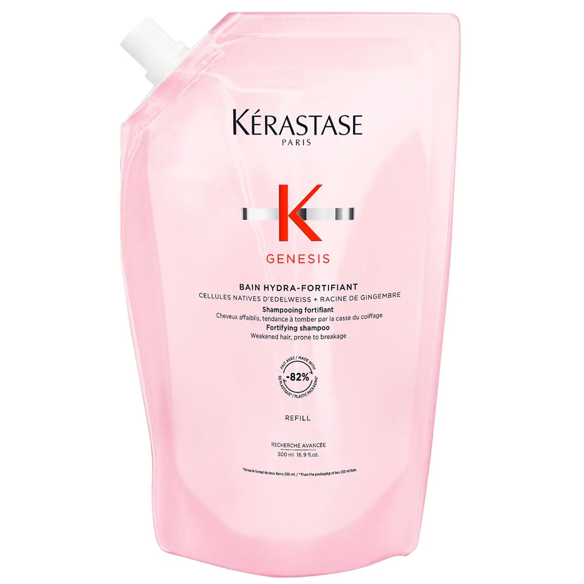 Kérastase Shampoo ml Genesis Bain Hydra-Fortifiant Refill 500 ist eine Nachfüllpackung, die eine stärkende Pflege für geschwächtes, zu Bruch und Ausfall neigendes Haar bietet. Angereichert mit Ingwerwurzel, Edelweißzellen und Aminexil schützt dieses professionelle Shampoo täglich vor Haarbruch und äußeren schädlichen Einflüssen. Die Haarfasern werden gestärkt und erhalten eine hohe Widerstandskraft, um Haarausfall aufgrund von Haarbruch zu reduzieren. ml ml ml Die Nachfüllpackung ist so konzipiert, dass die vorhandene 300er- oder 500er-Packung einfach nachgefüllt werden kann, wodurch der Kunststoffverbrauch im Vergleich zu zwei 250er-Fläschchen um 82 % reduziert wird. Außerdem besteht die Nachfüllpackung aus 100 % recyceltem Kunststoff**.