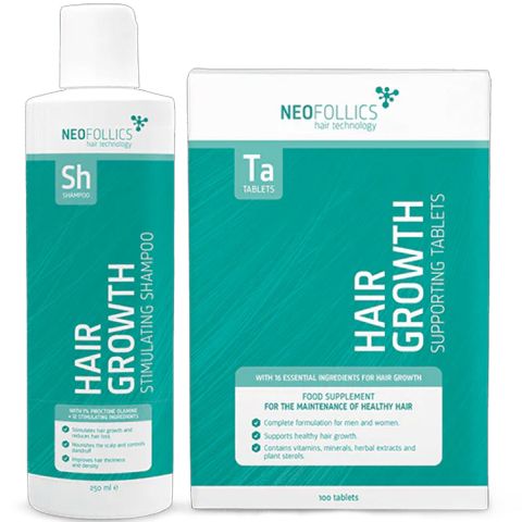 Neofollics Dunner Wordend Haar Das Advantage Set ist eine komplette Haarwachstumsbehandlung für Männer und Frauen mit dünner werdendem Haar oder beginnendem Haarausfall. Das Set kombiniert die leistungsstarken Hair Growth Stimulating Shampoo und Supporting Tablets, um das Haarwachstum sowohl von innen als auch von außen zu stimulieren. Die Formel mit Neoxyl®, Biotin, Zink, Pirocton-Olamin und Pflanzenextrakten nährt die Haarfollikel, reduziert Haarausfall und sorgt für kräftigeres, volleres und gesünderes Haar. Perfekt als sanfter Einstieg in eine effektive Haarwuchs-Routine.