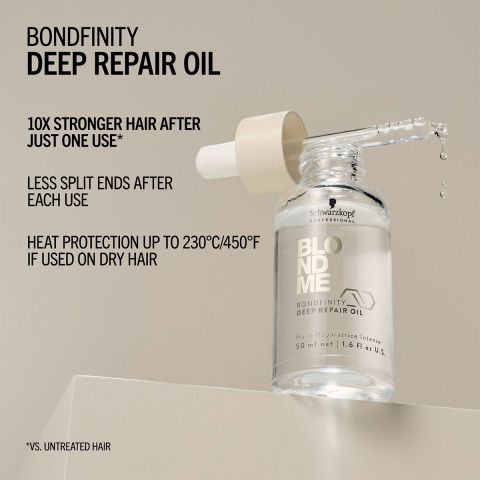 Schwarzkopf - Blond Me ml -Bondfinity Repair Oil - 50 stellt die Gesundheit des Haares wieder her, indem es widerstandsfähige Haarbindungen schafft und das hauteigene Keratin einkapselt - proaktive, dauerhafte Reparatur für Haar, das nach nur einer Anwendung* 20-mal stärker ist. Außerdem glättet es poröses Haar und sorgt dank 24-stündiger Frizz-Kontrolle für schönen Glanz und schützt mit einem Hitzeschutz von 230°C vor Stylingschäden.
