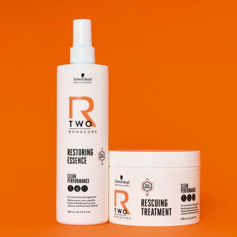 De Schwarzkopf Professional - R-TWO - Rescuing Treatment herstructureert, herstelt en versterkt zeer beschadigd haar dat chemisch te zwaar is behandeld en fysiek gestrest is. Het ontwart, voedt en verbetert de doorkambaarheid van het haar. Beide producten zijn voorzien van de Double Bonding technologie, die het haar van binnenuit herstelt en zo de kracht en veerkracht van het haar verhoogt, terwijl het tegelijkertijd de weerstand tegen toekomstige schade verbetert. Dit resulteert in aanzienlijk sterker haar en een langere levensduur.